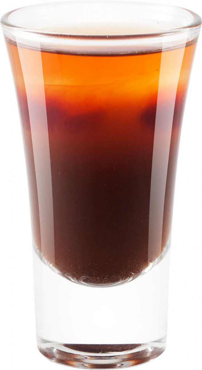 Огненный коктейль. Подается одним выстрелом. Для его приготовления понадобится 15 мл водки, 15 мл Kahlua, 15 мл Baileys и 10 мл рома. Ингредиенты наполняют стакан слоями.