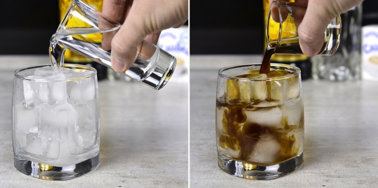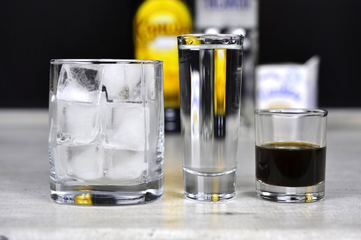 - Вылейте кофейный ликер на лед, затем на водку и слегка перемешайте ингредиенты.