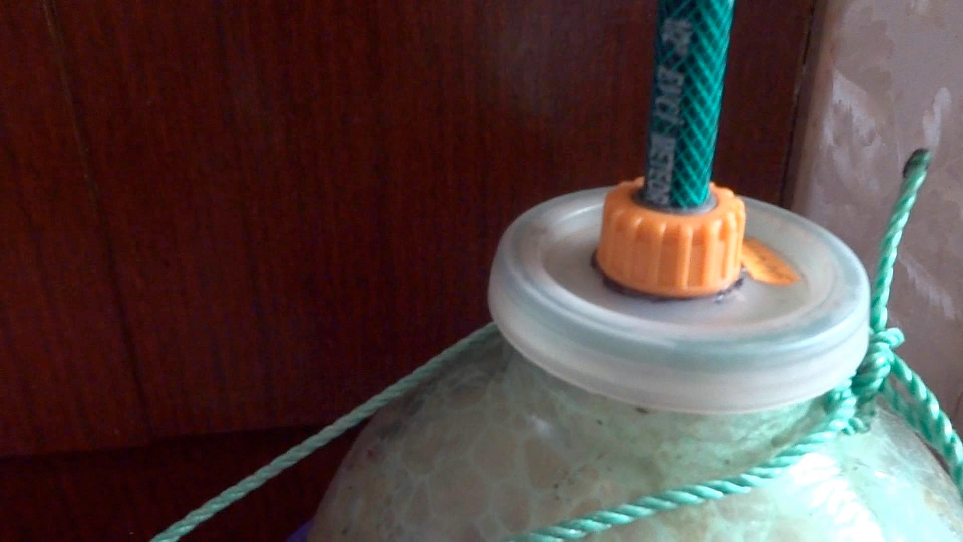 На этом этапе все же желательно делать гидрозатвор, а не перчатку. У меня нестандартный флакон, нормальные крышки не подходят, и я не мог достать крышку, поэтому я использовал метод, который использовал мой дед: он взял трубку немного толще капельной трубки, обернул ее несколькими слоями газеты , воткнул его в горлышко и заклеил пластилином. Трубка, конечно же, входит в подвешенную бутылку с водой, которая пузырится сама по себе, выделяя газ из вина, но не пропуская воздух в емкость.