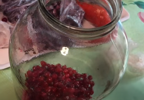 - Достаем ягоды из морозилки и, не размораживая, кладем в чистую 3-литровую банку.