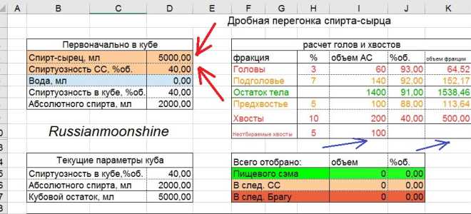 Ниже я прикрепил картинку, на которой указаны все важные колонки. Красными стрелочками показаны данные, которые необходимо ввести самостоятельно (спирт-сырец и спиртуозность СС). Синими стрелочками показываются пропорции, которые автоматически строятся на основе ваших цифр.