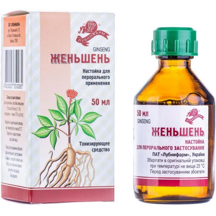Самая распространенная лекарственная форма — настойка женьшеня. Экстракты добавляются в порошки и таблетки. Чаще всего женьшень добавляют в пищевые добавки.