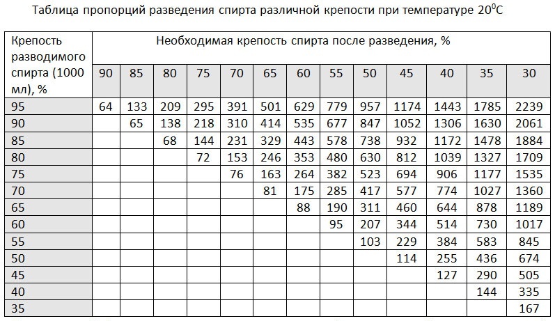В таблице разбавления спирта водой указано, что температура смешиваемых компонентов не должна отклоняться от 20 градусов Цельсия. Изменение стандартной скорости приведет к тому, что окончательная прочность раствора будет отличаться от ожидаемой.