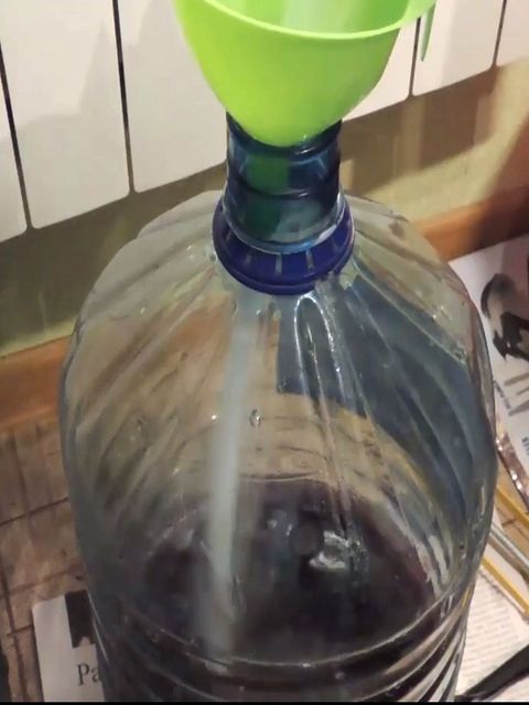 - С помощью воронки и марли перелить сок в 25-литровую бутыль и добавить 4,8 кг сахарного песка. Растворите его и положите в темное прохладное место, накрыв шею марлей. Таким образом получается около 15 литров подслащенной жидкости.