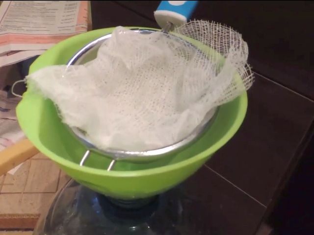 - Слить сок, процедить и несколько раз пропустить через марлю, переливая из одной емкости в другую.