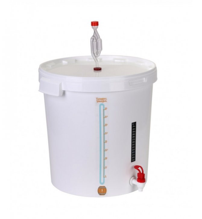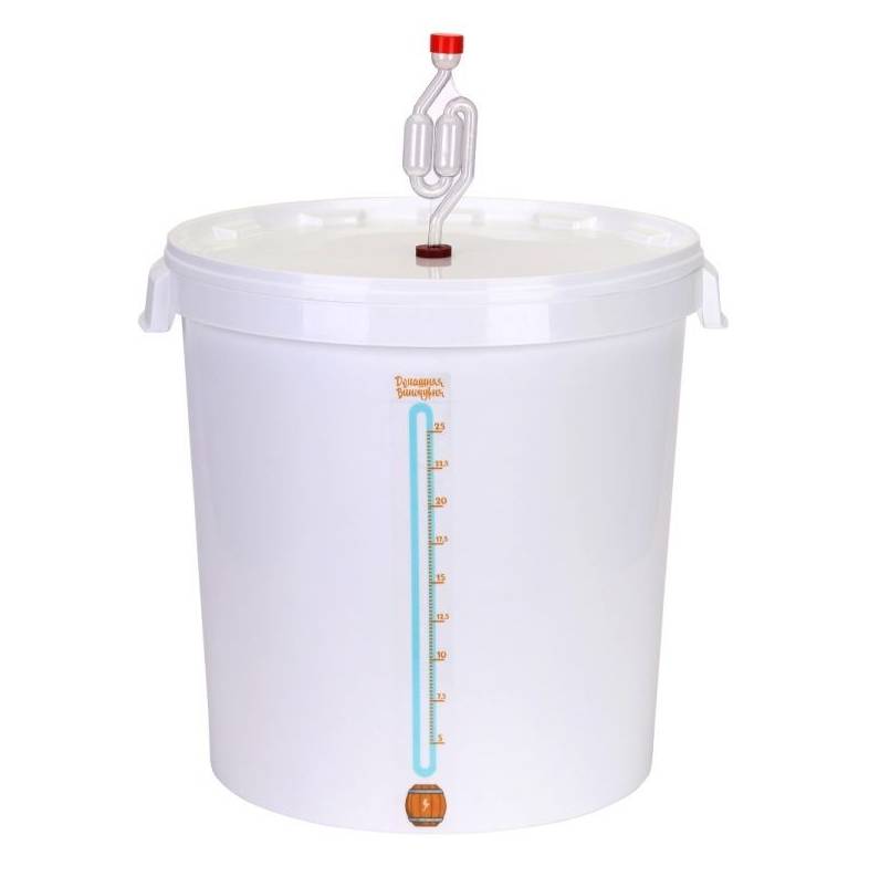 Основная проблема любого начинающего винодела — найти подходящую тару, из которой можно будет производить сусло. Если говорить о небольших объемах, используйте три-четыре рулона, подойдет пара трехлитровых банок. Но если нужно заквасить большее количество основы, например, для вина из ягод, которыми полон сад, то такой объем не очень подходит. Использование кастрюль и емкостей невозможно из-за неплотных крышек. Решить сложившуюся ситуацию призвана пластиковая емкость объемом 30 литров, крышка которой снабжена силиконовой крышкой. Кроме того, в комплекте поставки уже есть гидрозатвор, поэтому после покупки модели вы можете сразу приступить к изготовлению вина.