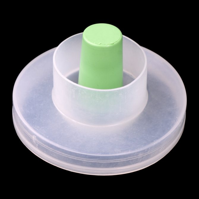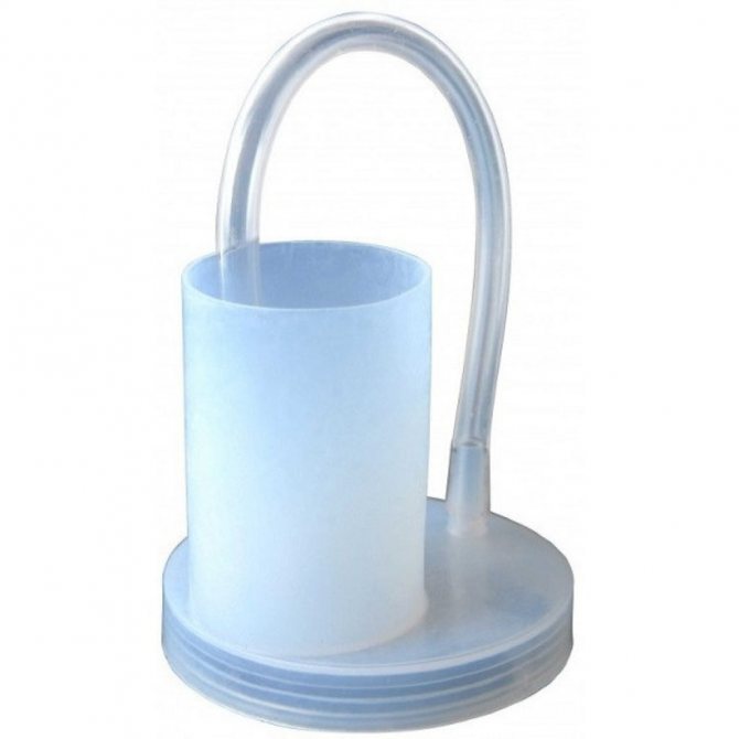 Такой «прибор» снабжен углублением, в которое можно заливать воду. Посередине выемки находится пластиковый штуцер, на который есть заглушка.