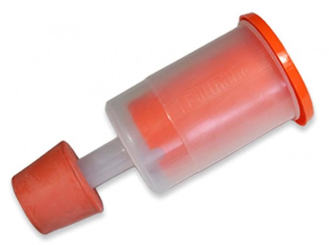 Если перед вами будет бутылка сусла или вина, то есть смысл поставить на бутылку такой гидрозатвор, влить воду в углубление, закрыть пробкой. Выходящий углекислый газ булькает в воде, и кислород не попадает в емкость. Единственный недостаток — в нишу наливают мало воды, необходимо проверять ее уровень. Если он опустится ниже крышки, сифон перестанет работать.