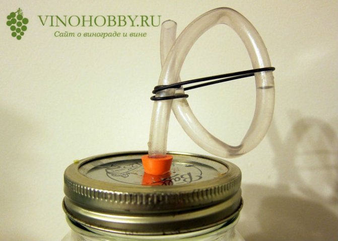 Этот гидрозатвор позволяет точно определить степень готовности вина или сусла. Если в банке с водой в течение 1-2 дней не будет пузырьков, несладкое сусло готово к перегонке, а вино готово слить с осадка.