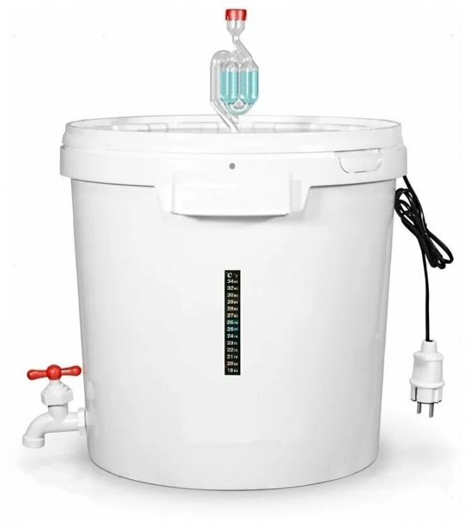 Более совершенная модель, чем предыдущий танк. Помимо гидравлического замка, модель оснащена термометром, показывающим температуру стирки. Градусник позволит избежать ошибок при выборе температурного режима. Последнее напрямую продиктовано составом сусла. Так, например, сахарные дрожжи комфортно себя чувствуют в диапазоне температур 24-27 градусов Цельсия, солодовые дрожжи 63-65 — полтора-два часа. Помимо прилагаемого к бачку гидрозатвора, здесь есть клапан пробкового типа. Учитывая вместимость (30 литров), это довольно полезный агрегат, позволяющий сливать жидкую составляющую, не переворачивая емкость вверх дном. Поставка такая же, как у модели выше, включая наклейку с накипью. Правда, лестница нарисована, поэтому выполняет скорее декоративную функцию, что хорошо видно на фото.