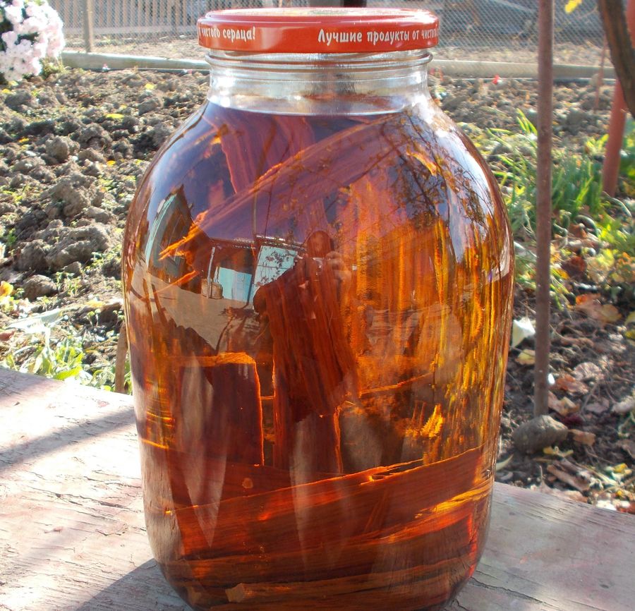 - Разливаем весь самогон по банкам и засыпаем его дубовой корой из расчёта 1 столовая ложка коры на литр самогона. Настаивать продукт можно сколько угодно, примерно через месяц напиток уже будет иметь отличный цвет и аромат. Если никуда не спешите, то 2–3 месяцев будет вполне достаточно.