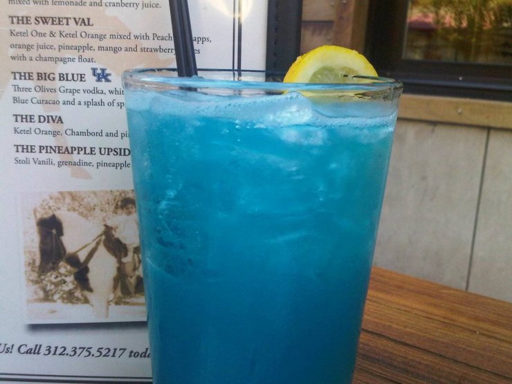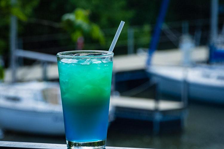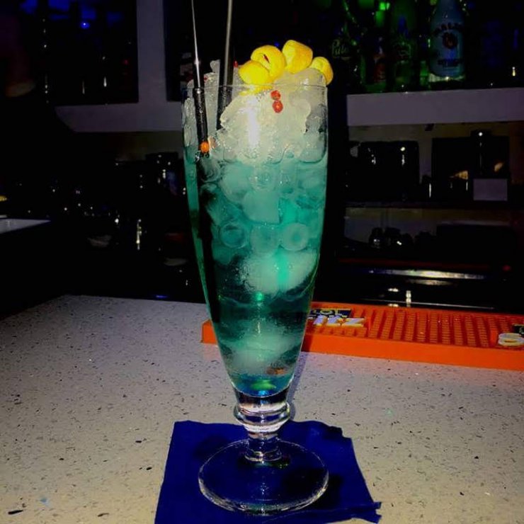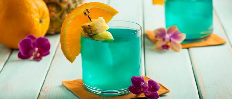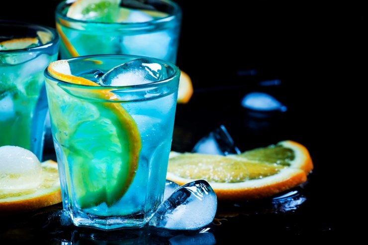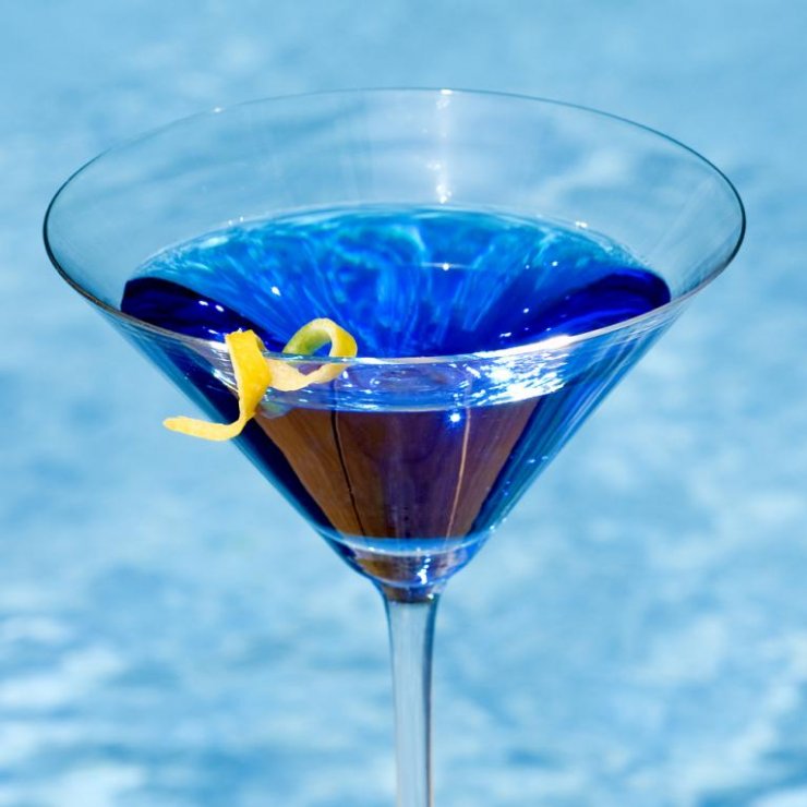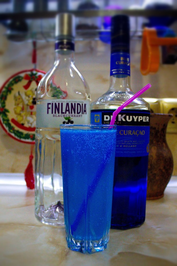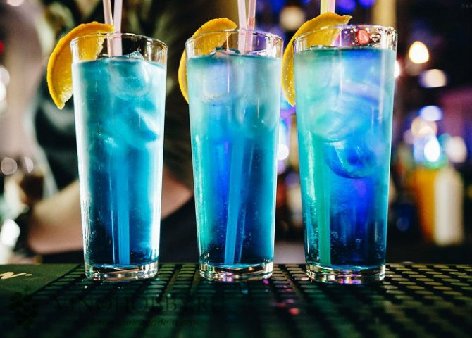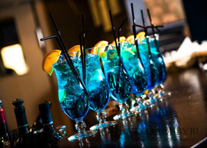 Каждый уважающий себя бар предлагает ассортимент голубых коктейлей Blue Lagoon. Очень актуален в летнее время года. Напиться нельзя, но хорошее настроение после пары рюмок гарантировано.