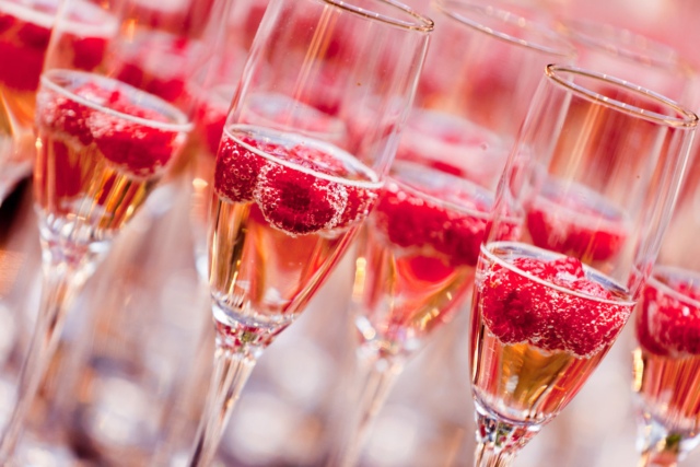 2. Перелить через дуршлаг в бокал, добавить шампанское.