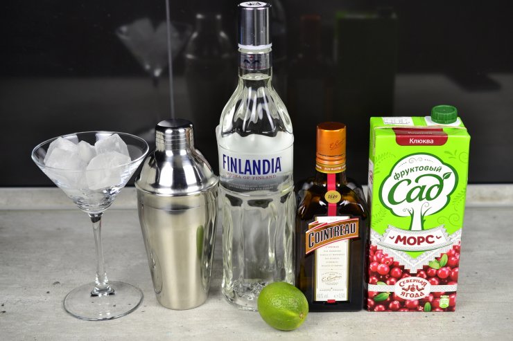 - Налейте в шейкер водку, куантро, клюквенный сок и сок лайма.