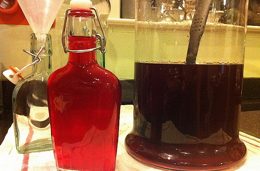 После этого смешайте сок со спиртом, перелейте в бутылку и добавьте еще сахара. Бутылку оставляем в прохладном месте на 5-6 дней для урегулирования помутнения и растворения сахара, затем аккуратно снимаем его с осадка.