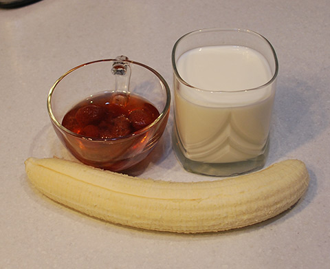 - Хорошо промойте клубнику под проточной водой. Очистите банан, нарежьте мякоть небольшими кольцами и положите в блендер. Включите блендер на пару минут, пока не образуется пюре.