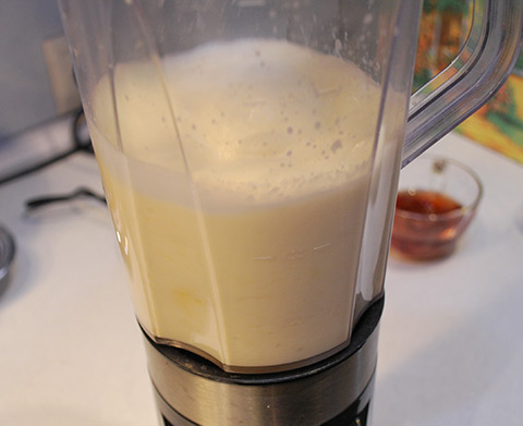 - Залейте молоком и снова включите блендер. Отключайте только тогда, когда вся масса хорошо перемешается и станет однородной.