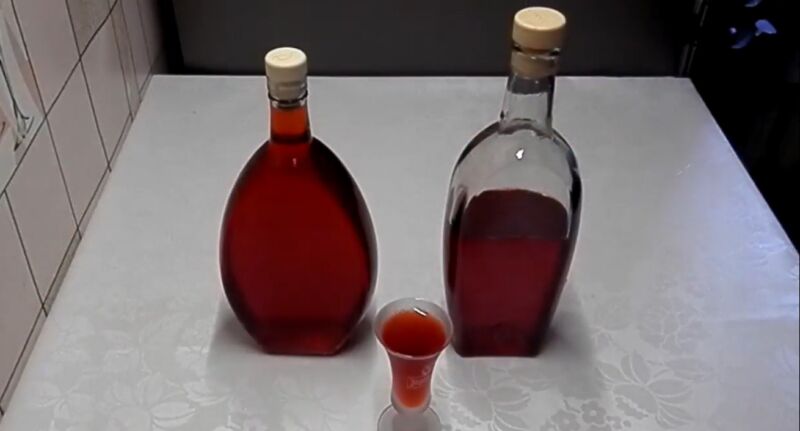 Закрыть, убрать в темное место, куда не проникают солнечные лучи. Настаивать напиток требуется в течение 7 суток, встряхивая ежедневно банку с содержимым. По истечении срока выставить тару в холодильник на 4 дня. Процедить, разлить по стерильным банкам.