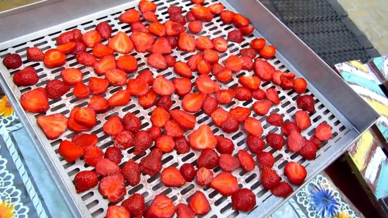 Для начала промойте клубнику и удалите плодоножку. Для того, чтобы сушка прошла быстрее разрежьте ягодки на небольшие плоские дольки. Выкладываем всё на решётку и включаем сушилку на 40 градусов на 2 часа. После устанавливаем на 60 и удерживаем до готовности. Обратите внимание, что по итогу клубника должна засушиться на 80-90 %.