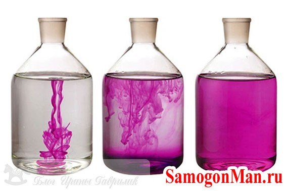 При растворении марганца в воде, получаем нужный антисептик, от светло-розового до темно-малинового.
