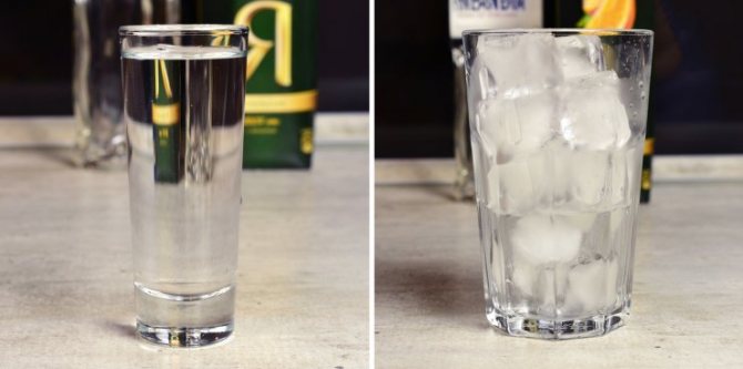 - Положите кубики льда в высокий стакан и залейте их очень холодной водкой.