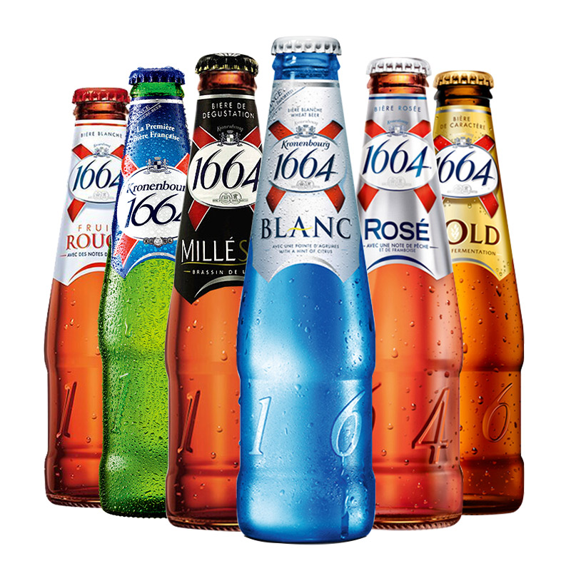 - Kronenbourg 1664 Blanc Пшеничное нефильтрованное пиво соломенно-желтого цвета с апельсиновой цедрой и кориандром. Алкоголь: 4,5-5%. Выпускается в синем флаконе с 2006 года. Аромат: пряный, с цитрусовыми нотками. Вкус: фруктовый и солодовый. Во Франции доступны несколько вариантов: 1664 Rosé (розовое), 1664 Fruits Rouges (красные плоды), 1664 Passion Citron Vert (лайм) и 1664 Mûre Myrtille (ежевика, черника). Идеально сочетается с морепродуктами, жареной и копченой рыбой, фруктовыми десертами.