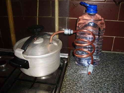 Брагу мы уже сделали по этому рецепту, она у нас поспела и мы можем делать самогон. Теперь о самогонном аппарате. Я использую обычную советскую скороварку из алюминия. Конечно, для того чтобы делать самогон, лучше использовать скороварку из нержавейки, поскольку нержавейка нейтральный материал и не даёт никакого запаха и никакого привкуса. Алюминий всё же, как мне кажется придаёт какой-то свой запах.