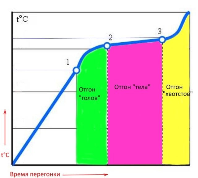 Давайте пройдём по температурным этапам перегонки. Для начала изобразим график схематически: