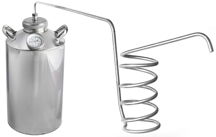 Это наиболее простой аппарат, который способен нагревать брагу в перегонном кубе и охлаждать её в змеевике (за счёт холодной воды в ведре или высоком тазу). По цене такое оборудование можно назвать бюджетным, так как цена не превышает 5–6 тысяч рублей.