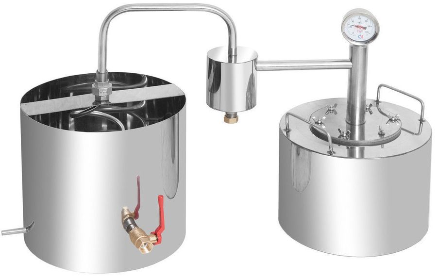 Существует ещё Дачно-Деревенский вариант, который стоит гораздо дороже, но очень удобен в эксплуатации. Конструкция представляет из себя перегонный куб, паропровод и бак охладитель, через который как раз проходит змеевик.