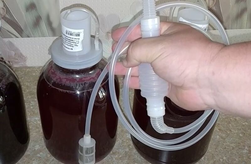- Банку закрывают крышкой, в центре которой проделано отверстие. В него вставляется тонкая резиновая трубка, так что один конец погружается в сусло, а другой — в другую емкость, наполненную водой. Когда пузырьки газа перестанут поступать во второй сосуд, вино считается готовым к декантации.