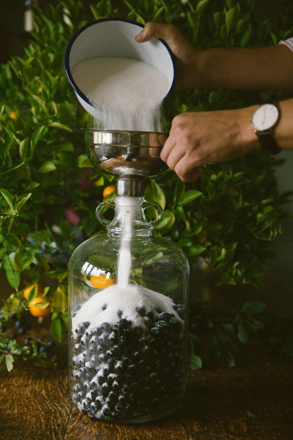 4. По истечении времени добавьте туда же воду и сахар. В рецепте необходимо соблюдать пропорции для 10-литровой банки на 1 кг сахара и примерно 3-4 литра мякоти черной черноплодной рябины.