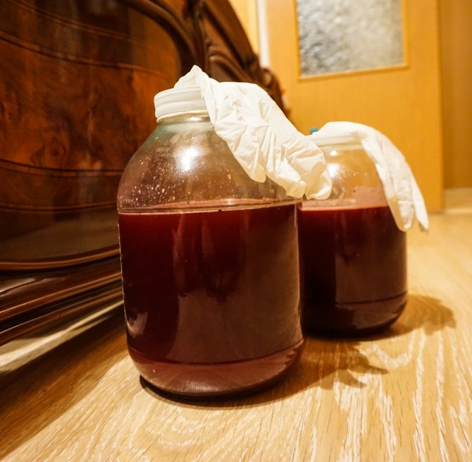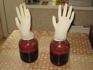 - Готовое сусло разлить по банкам, оставив место для пены и свободного выделения углекислого газа. Установите медицинскую перчатку, обязательно сделайте прокол иглой. На этом этапе вино требует тепла, поэтому лучше всего оставить банки при температуре около 20 ° C.