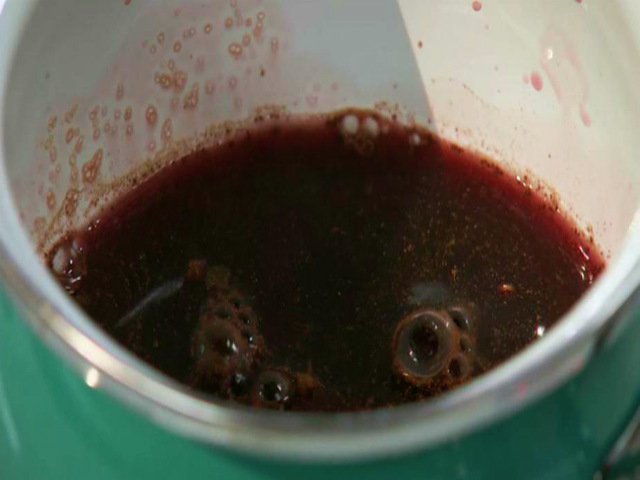 3. По прошествии нескольких дней приготовьте емкость, в которой можно будет определить, сколько сусла вы произвели. Накройте посуду марлей и процедите сок ягод из мякоти. Последние придется хорошо отжимать.